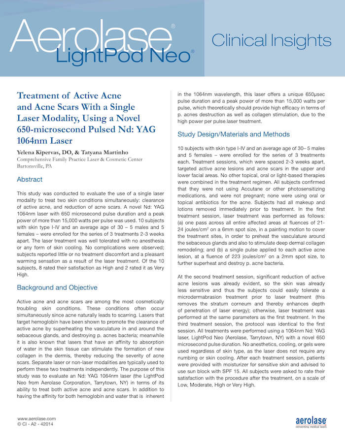 Treatment of Active Acne and Acne Scars With a Single Laser Modality, Using a Novel 0.65 millisecond Pulsed Nd: YAG 1064nm Laser
